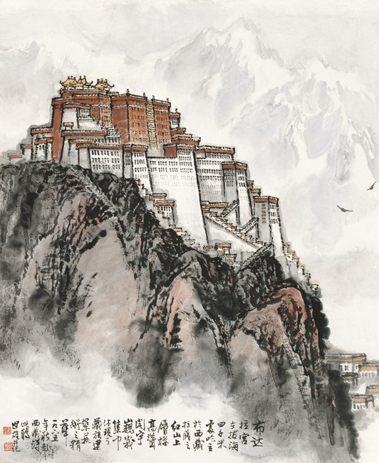 离开西藏18年后,梁世雄创作出水墨设色山水画《布达拉宫》。画作上布达拉宫高耸入云,画面下方晕染出缭绕烟云。赖志强认为,这是一件以西藏为主题、能载入20世纪下半叶中国美术史册的重要山水画作品。