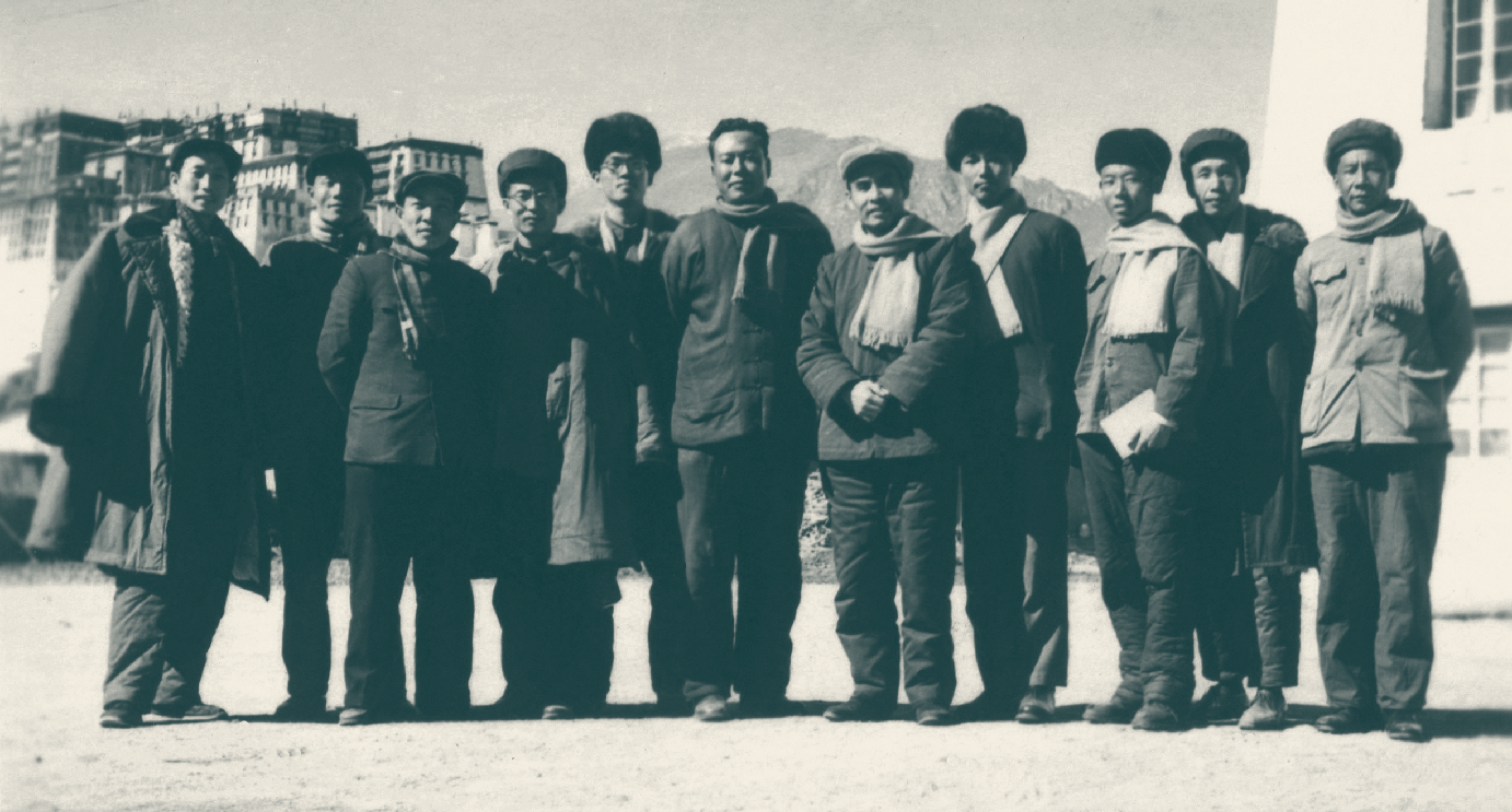 随中央代表团入藏的七位艺术家于1965年冬在拉萨合影。刘济荣(左四)、杜英信(左五)、牛文(中)、姚耕云(右四)、其加达瓦(右三)、梁世雄(右二)、李焕民(右一)