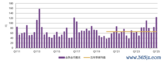 与金饰消费形成鲜明对比,一季度金条与金币投资创下历史第二高的季度水平,仅次于2013年二季度。一季度金条金币需求达124吨,环比激增48%,同比上涨12%,考虑到同比的双位数增长是基于2024年一季度本就很高的基数之上,这一成绩便更为亮眼。