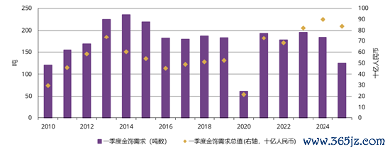 不过在季节性因素的驱动下,一季度中国市场金饰消费较去年四季度仍环比回升18%。得益于需求量吨位的环比回升和金价的显著上涨,金饰消费额环比增幅达29%。